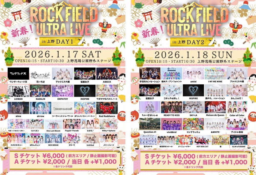 380組以上のアイドルグループを擁するレコード会社「rock field(ロックフィールド)」は、主催ライブイベントの最新回となる「新春 rock field ULTRA LIVE in 上野 DAY1」を2026年1月17日に、「新春 rock field ULTRA LIVE in 上野 DAY2」をその翌日2026年1月18日に、2日連続で開催することを決定いたしました。